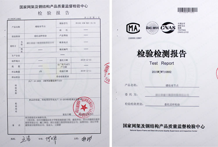 所用螺栓球節(jié)點均通過國家產(chǎn)品質(zhì)量檢驗